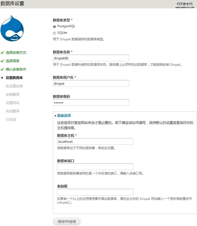 ③、选择PostgreSQL,数据库名称drupaldb,用户名drupal,密码输入上面创建drupal用户时的密码
