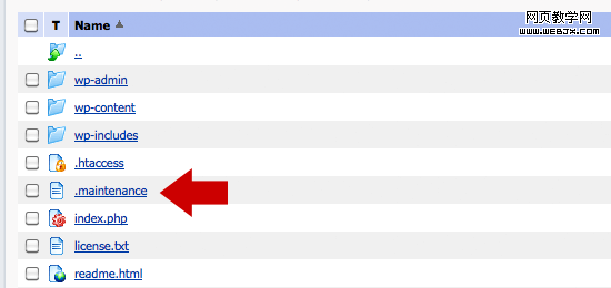 在无法登入网站管理界面的情况下,要解决问题真是件让人沮丧的麻烦事。幸好这时候不登入后台也可以把网站找回来。登入FTP,进入根目录,删除.maintenance文件。文件名的开始部分是一个点,如果你没有用FTP找到这个文件,可以试试登入服务器的控制板,然后通过文件管理器找到这个文件并删除。下面是.maintenance文件在根安装目录下的显示截图: