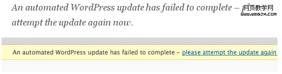 如果你被自己的网站拒之门外了,删除.maintenance文件可以让你回到管理后台以及网站的其他页面。当你回到后台后,WordPress会提醒你最近更新失败并显示如下信息: