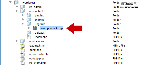 除此之外,你可能还需要更改/upgrade/目录权限。从下面的截图中可以看到,WordPress用/upgrade/目录存储升级过程中的临时文件。