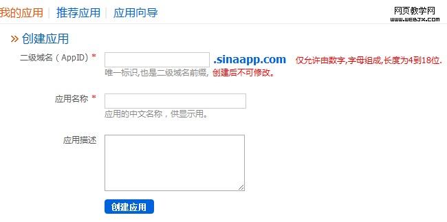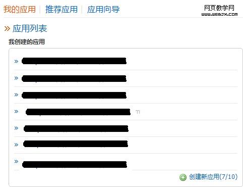 2、创建应用:注册登录后,点击“我的应用”,能够显示出已经创建的应用列表。点击下面的创建新应用,进入应用设置。