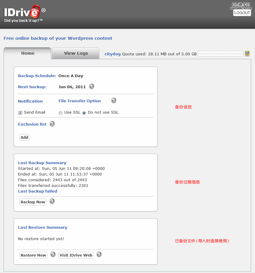 另外,IDrive的默认备份频率为每天一次,有点频繁,如果不打算按这个频率备份,你只要退出插件的登录界面就行(点右上角的LOGOUT),等你想备份的时候,重新登录即可!