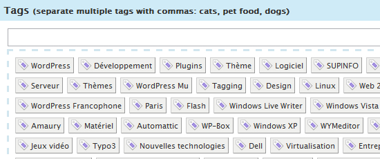 如果你经常给文章加标签,可能需要使用WordPress插件 Simple Tags,它拓展了WordPress中的标签功能。帮助你管理关键词,根据你的文章内容给出相关关键字的提示 (使用免费的网络服务Yahoo Term Extractions aPI),并且允许你批量地编辑和替换现有的标签。