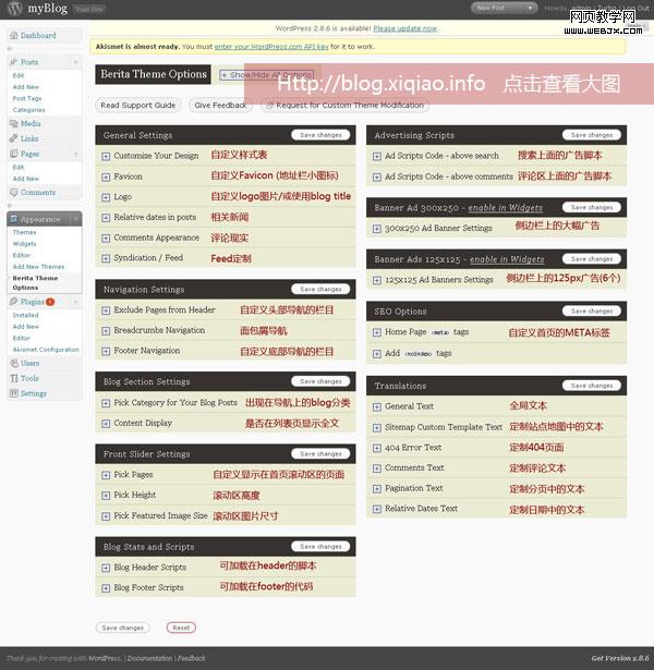 在左侧菜单的Appearance里可以发现多了一项Berita Theme Options .这就是定制系统。如下图。我做了粗略的说明。