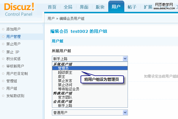 搜索到用户后,对该用户所在的用户组编辑为管理员组。