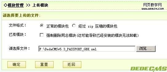 选择“正常的模块包”,在请选择文件的地方选择你刚才下载的整合包文件(DedeCMSv5.3_PASSPORT_GBK.xml文件),点确定