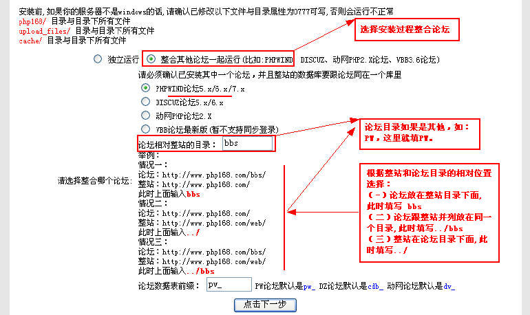 | 二、是否整合论坛 安装过程需要整合论坛的话,要确保先安装好论坛;也可以以后任何时候在PHP168整站后台整合论坛。 |