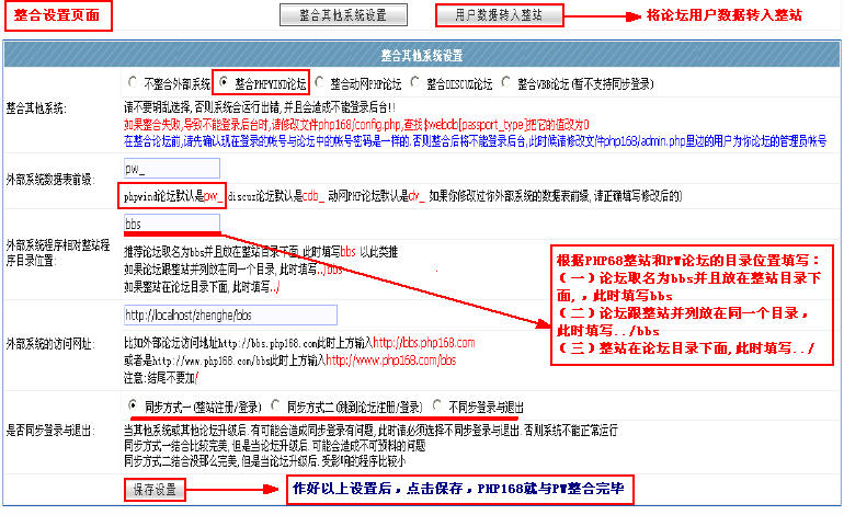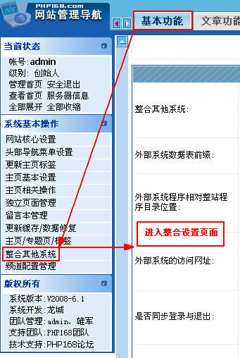 如果安装PHP168整站系统的时候,没有整合PW论坛的话,可以在使用过程中的任何时候进行整合。登陆PHP168系统后台--->基本功能--->整合其它系统,方法如下。