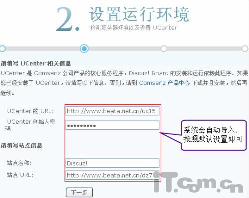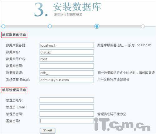 填写好 UCenter 信息和 Discuz! 论坛信息后,点击“下一步”进入数据库安装页面,如下图所示: