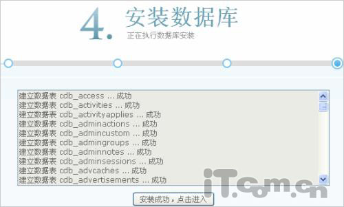 填写好 Discuz! 数据库信息及管理员信息后,点击“下一步”,系统会自动安装数据库直至完毕,如下图所示: