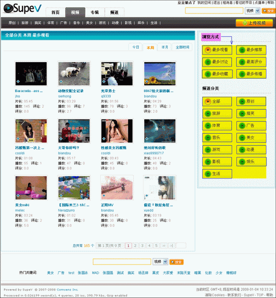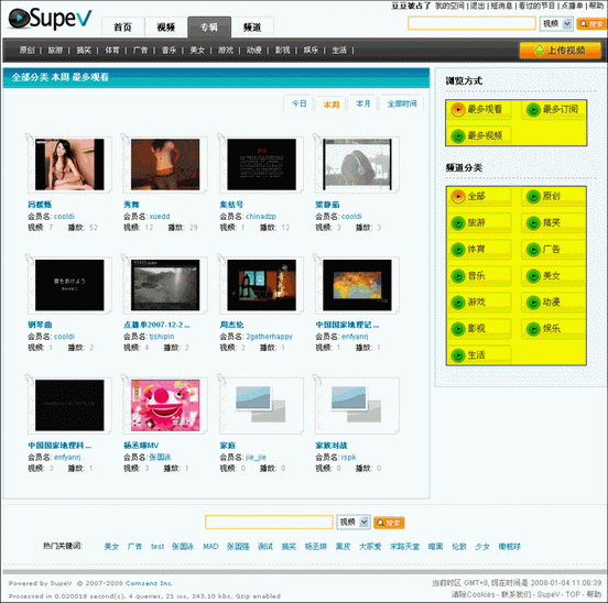 “视频”栏目为用户提供了一个非常人性化的界面,用户可以选择不同的“浏览方式”浏览站点的视频,SupeV目前提供了“最多观看”,“最多讨论”等6种方式。同时,会员还可以选择“今日”热点,或者“本周”“本月”热点进行浏览。