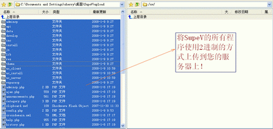 将您下载到的SupeV安装包解压,然后将upload文件夹里的所有文件上传到服务器。注意务必使用2进制的方式上传SupeV程序。