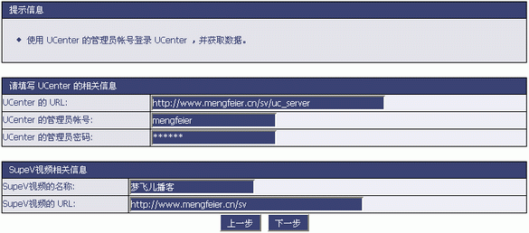 5、UCenter已经安装完毕,进入安装SupeV的步骤中。如下图,请填写UCenter的URL,UCenter的管理员帐号,UCenter的管理员密码,以及SupeV站点名称和站点URL。