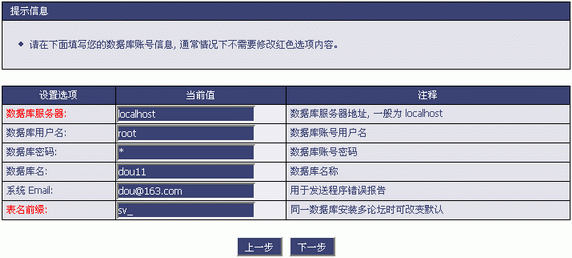 7、检查完毕之后,进入设置SupeV站点数据库信息的页面,请填写正确的数据库信息。注:如果是虚拟主机用户,数据库用户名和密码一般是由虚拟主机空间商提供;如果是独立主机,数据库用户名和密码就是你安装MySQL时填写的用户名(一般为root)和密码(建议新建个数据库用户安装,使用root会有安全问题)。表名前缀是填写SupeV数据的表前缀,默认为 sv_ 。填写完毕请点击下一步。
