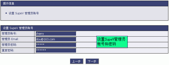 8、设置SupeV的管理员帐号和密码,以及管理员 Email。