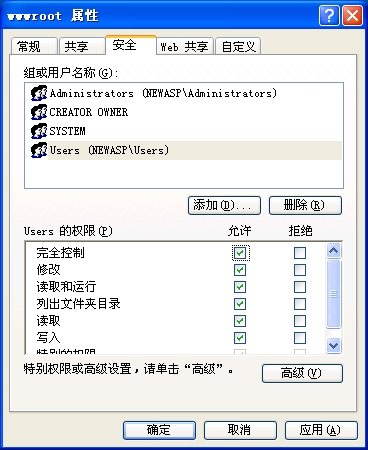 2、检查是否在WIN2000的资源管理器中,将网站所在目录对EveryOne(Users)用户打开所有权限。具体方法是:打开“我的电脑”----找到网站所在文件夹----在其上点右键----选“属性”-----切换到“安全性”选项卡,在这里给EveryOne(Users)用户所有权限。