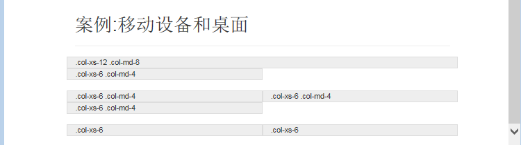 从上面的案例我们可以发现,当小尺寸的屏幕的时候使用.col-md-*的时候它会呈现堆叠的状态,那么开发人员肯定有时候需要小尺寸的屏幕页面展示也要是水平排列的。那么我们的.col-xs-*(小于768px屏幕的样式类)就派上用场了。