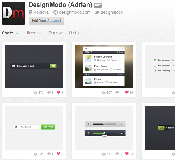 另一方面,Dribbble允许你作为一个”观察员”注册,拥有正式会员创建用户的功能,这是一个非常好的过程,因为这一过程显示了你对加入这个社区的重视。一旦你创建了用户,添加了你的照片、技能、个人简历、地址以及最重要的与你工作有关的URL,你就要尽量让自己金光闪闪一些,这样才能真正的被邀请,记住要多关注其他人的作品,多多点赞喔~