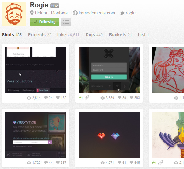 Dribbble最受欢迎的截图将会在“Popular” page展示出来,通过研究这些最受欢迎的作品你会学习到很多知识,登上这个界面展示作品就可以得到更多关注哦~