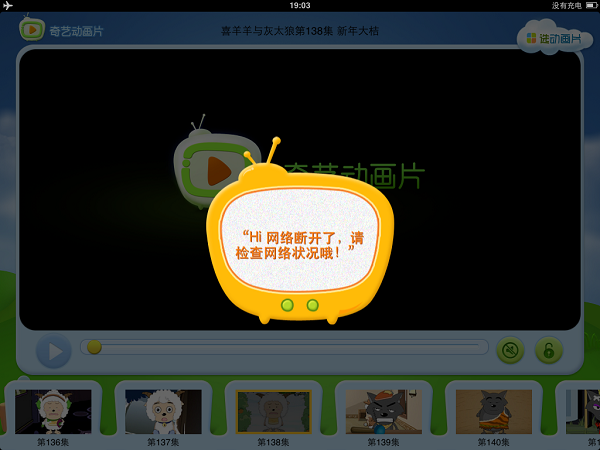 iPad版奇艺动画片的启动界面以品牌绿为主,配合多种红蓝黄等颜色,整体写实蓝天绿草地的真实意境,营造轻松有趣的氛围。