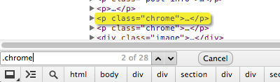 在 Firefox ,你可以在“检查器”面板搜索特别的节点。面包屑右边有个小的搜索框有同样作用。