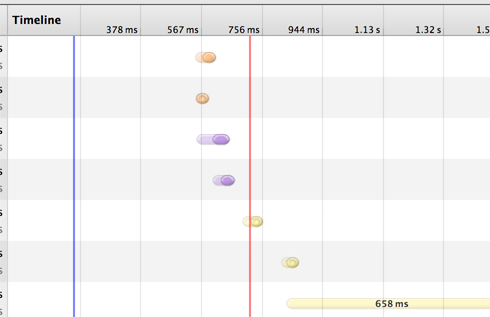 Chrome 和 Safari (以及 Firebug 网络面板)的网络时间轴显示网页加载有多快,用一条线标记 DOMContentLoaded 和 load 事件触发的时机。