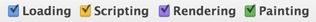 时间轴图表每一条代表单帧动画,不同的颜色表示如下: 蓝色表示加载任务,黄色表示脚本任务,紫色表示渲染任务,绿色表示绘制任务,白色区域代表空闲时间。