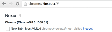 访问检查页(chrome://inspect ),找到设备(需要 Chrome Canary 28 +),找到要调试的标签。点击页面 URL 右侧的“Inspect 检查”链接。