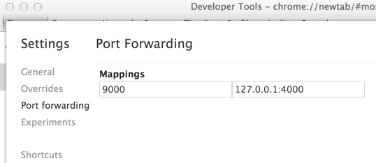 在 Port Forwarding 标签,输入想转发的端口(例如 9000),地址,应该可以映射到本地的电脑了。现在,在移动设备输入 localhost:端口号(如 localhost:9000),本地的站点应该加载到移动设备上了,并且可以调试了。