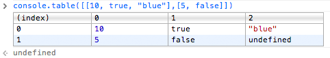 例如:console.table([[10, true, "blue"],[5, false]]) 将输出以下格式: