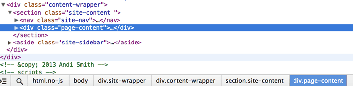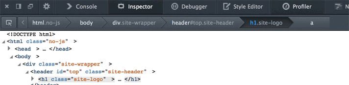 当你检查 DOM 树的节点时,节点的 DOM 路径面包屑列表显示在开发工具里。