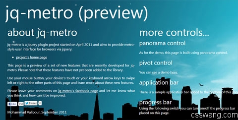 一个jQuery插件,用来创建Metro风格的界面。目前包含Panorama、Privot、进度条、列表选择、切换、按钮等。
