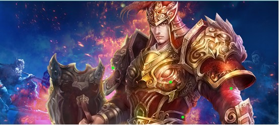 添加了火焰的光效,人物显得比较动态鲜活,整个画面更有一种对抗的战火纷飞的感觉,但是现在整个画面结合度还不够高,这个时候我们往往会通过调整人物的色调和对比度等方法来使整个画面更加和谐,但是不要漏掉一个重要的步骤就是环境色,可以通过在人物身上添加环境色来使人物和光效得到更好的结合,而且有质感的光效就像现在用的火焰,可以将材质叠加到人物的明暗面让画面更加真实生动(如图中绿点标示部位)。最后,我们可以添加一些飘动的零散的火光,让火焰的更有动感。