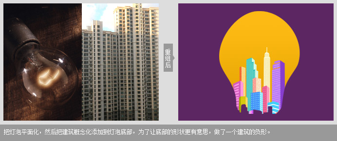 1.灯泡和建筑都是我们生活中比较常见的事物,二者组合到一起的画面不是很常见,当我们想到这两个元素的时候,通过重构、正负形等设计手法,让他们联系到一起。