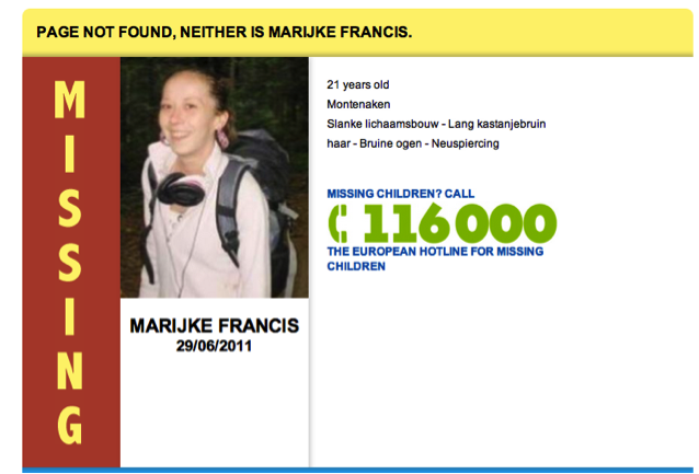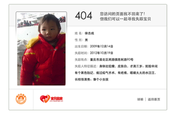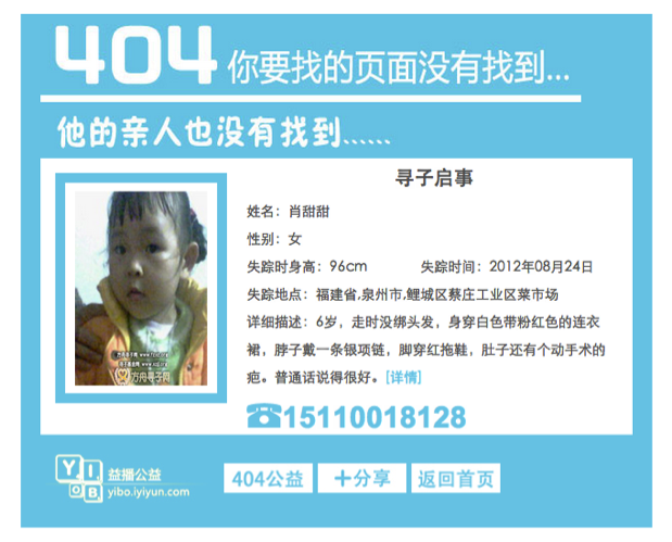 欧洲的一家公益组织Child Focus在去年10月推出了一项名为“NotFound”的计划,利用网站的404页面帮助找回走丢的孩子。