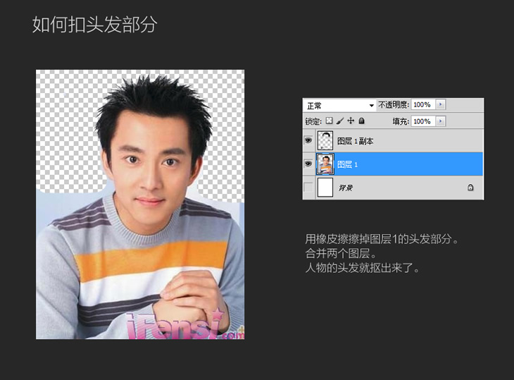 用橡皮擦擦掉图层1的头发部分。合并两个图层。人物的头发就抠出来了。