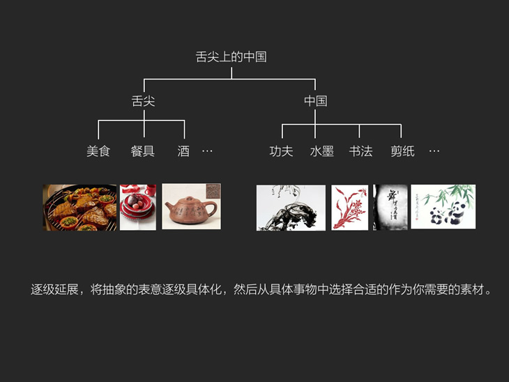我们先将“舌尖上的中国”提取关键字“舌尖”、“中国”。舌尖让我们联想到什么呢?有美食、餐具、,等等。中国让我们联想到什么呢?功夫、水墨、剪纸、龙、国画,等等。