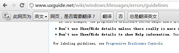 情景2:Chrome浏览器有一个功能,当你第一次打开一个外文站点,他要出一个对话框询问你的意见要不要翻译。这个时候该用“是否”来询问还是“确定”呢?