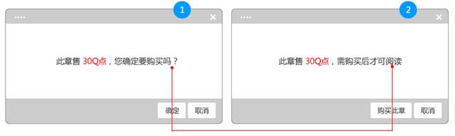 对话框2,“购买此章”的button也起到了引导作用,又直观。可没用“确定”购买的问句,也没用“确定”的button,会有问题不?