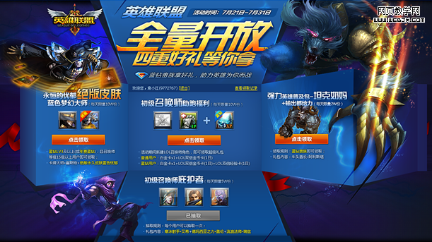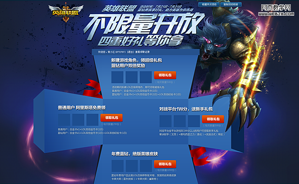 通常领取礼包的活动页面,都会运用到游戏相关人物、标题、礼包、LOGO等素材,一般我们会简单的将页面的信息做好布局。在这个阶段中,我们已经给页面基本的方向做了定位,当然是需要和产品同事一起讨论确认的。接着就是增加视觉细节和礼包内容,并完成最终的设计稿。但是,我们有没有花一点时间去思考一下,活动页面的关键词“四重好礼”。是否有其他更为贴切的设计方式呢?经过一番思考,我们可以探索性的去尝试,将礼包放在盒子里的设计思路。
