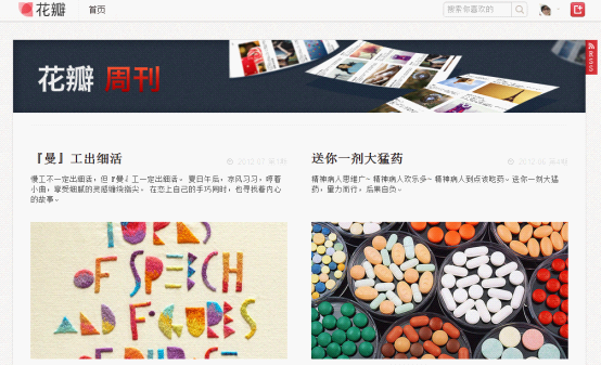 如何给用户以最新最热的内容呢,花瓣周刊是方式之一。通过一个简单的页面聚合最流行的内容,也是帮用户发掘兴趣的手段之一。