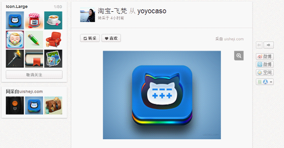 在首页中,查看某个图的详情的时候,与Pinterest不同,花瓣采取的是落地页面的形式,右侧的左右翻页可以帮用户查看该画板下的其它内容,而右箭头更大些,展示了更多的点击区域。通过差异化,下意识里帮助用户去选择点击右箭头实现右翻页,可以让用户在该画板停留更久些。