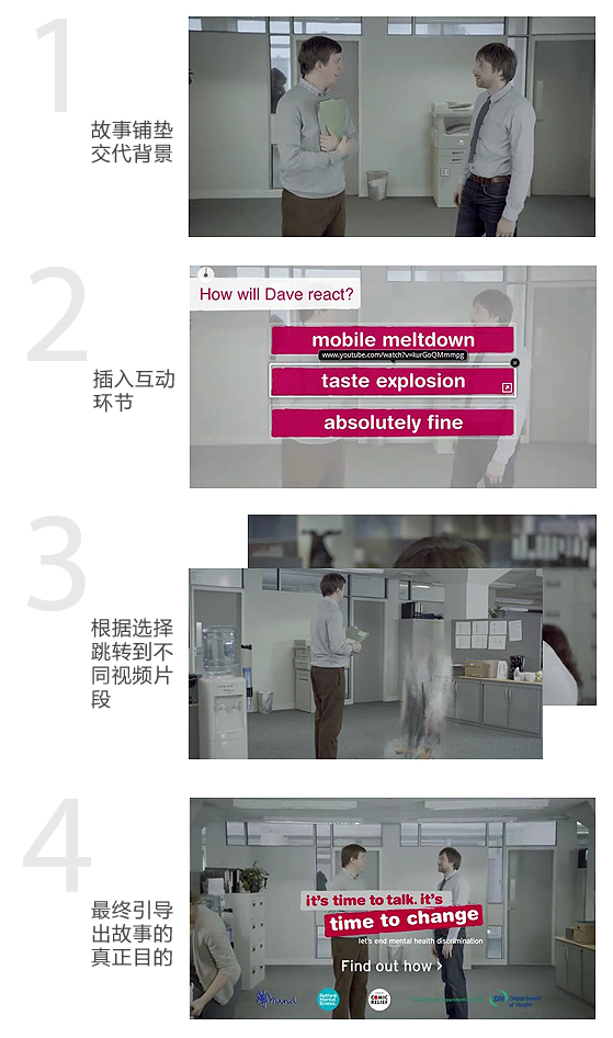 YouTube 上已经诞生了不少商业的与非商业的交互式视频,基本都属于会话式交互。得益于 YouTube 强大的在线视频编辑功能,设计者可以在视频中加入带有超链接的注释,在视频的播放过程中,先根据剧情内容设计好注释出现的时间,再在观看者选择时链接到相应的视频,就大功告成了,非常简单,效果可以很赞。