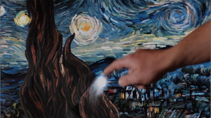 软件工程师可以拯救世界,这句话不是随便说说的。万能的 Coding 能实现各种令人意想不到的互动效果。最近工程师 PetrosVrellis 用 openFrameworks (一种开源的 C++Toolkit )实现了一段互动版的梵高名作《星空》( Starry Night ),效果很震惊,令我五体投地。视频中的演示是在触摸屏幕上运行的,很期待最终能它能以 App 的形式出现供大家欣赏把玩。