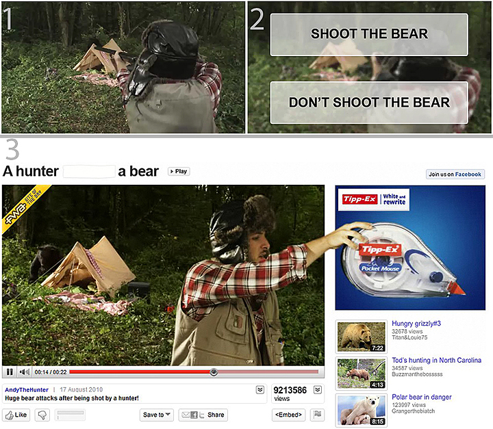 YouTube 上非常有名的一段广告"猎人与熊"( A hunter ___a bear )就是采用了定制式结合会话式, YouTube 注释再加 Flash 动画的手法。