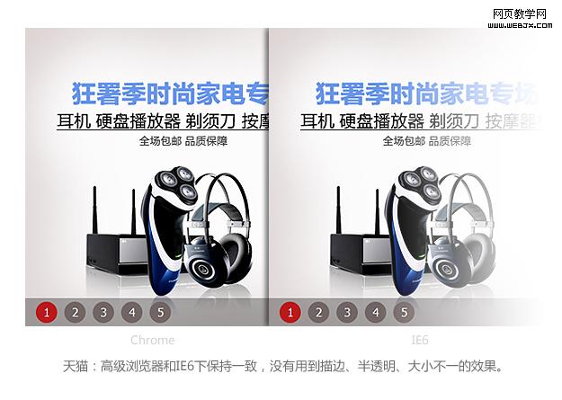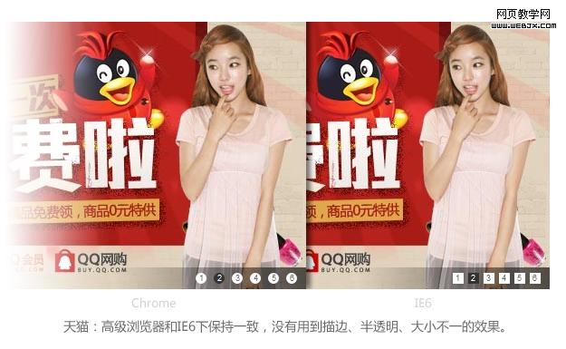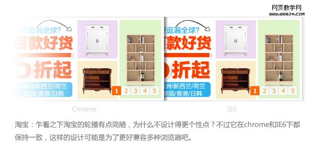 以上是前端工程师GG给我看chrome/IE6浏览器下的轮播样式测试效果,发现这2个浏览器都无法完全支持视觉稿的轮播效果,而且高级浏览器和IE6下的样式差异很大,这确实是一件让人郁闷的事情。头疼之余,先让我们看看其他网站的轮播是怎么兼容多种浏览器的: