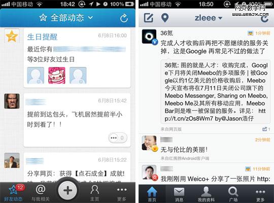九宫格也是目前普遍使用的一种导航模型,它将应用的所有一级功能纵横排列在首页,多用简洁或精致的图标展示,同时配合功能菜单文字,因此首页效果漂亮,可供设计师发挥的空间大。九宫格导航适合有多个同等重要频道的应用,特别是大而全的平台级产品,比如facebook、QQ朋友、人人等;不过九宫格的缺点也比较明显,其图标数量要适中控制,过多则可能出现左右分页,过少则可能为了堆砌菜单而在首屏添加不必要功能;同时菜单图标的横竖排列使得眼动轨迹往返移动,如果数量过多,则导致视觉定位频繁,识别率下降,不如列表来得顺畅利落;在九宫格导航模型中从一个子功能切换到另一个子功能时需要返回到主导航界面,操作效率底,所以越来越多的应用通过添加快捷操作来实现快速返回到首页,比如facebook点击导航栏的中央区域来回到首页;九宫格最大的缺点在于需要先选功能才能使用,无法去追求那个最刚性最频繁最唯一的东西,并让它直接展现给用户,九宫格容易让产品设计者停止做这样的思考,相比之下,tab标签导航便通过默认选中标签来实现了这一目标。