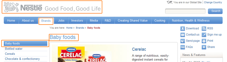 我们用导航原则来检验nestle.com的导航设计,这个页面通过页面标题“baby foods”告诉我们当前位置,通过网站logo,二级导航栏中选中的“Brands”,左侧三级导航栏选中的“Baby foods”,告诉我们这个页面的固定路径是从home,选择brands分类,再选择Babyfoods。且导航栏的每一个分类都可以被点击,可以让用户返回到上一级。这个页面完成了导航所需要的所有信息传达元素。我们也可以明显地找到页面中的: