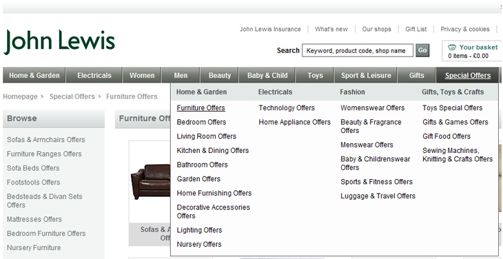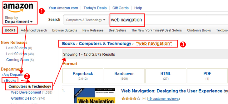 图6是在amazon浏览到web navigation的搜索结果页。图中将隐藏的页面路径和实际存在的面包屑都标示出来了。面包屑的每个节点标签在页面的其它导航方式中都有被选中的状态,且自上而下,从外到内形成包含与被包含的关系,从而形成一个隐藏的页面路径。这里使用的导航方式和前面都不一样,不止用了导航菜单,还使用了树形的级联菜单的方式。当前页面也不是用页面标题,而是直接用的实体面包屑的最后一级节点标签的强化样式。这个页面通过不同的方式完成了用户的导航需求。