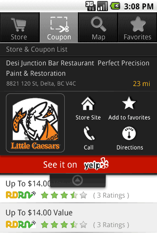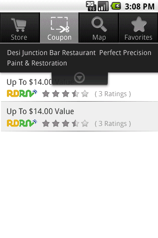 这个是一个Android平台的程序。一个优惠券列表页面,优惠券是我们最重要的显示内容。用户需要在单屏中预览更多的优惠券信息,商店信息次之,而tab导航将被保持以保证用户不会迷路。